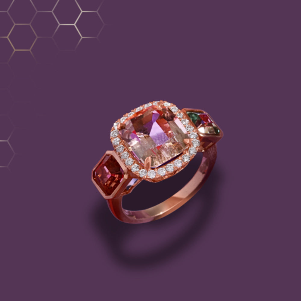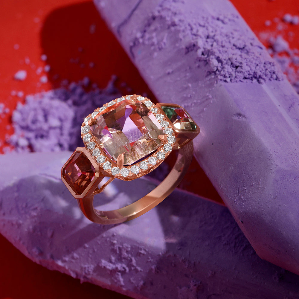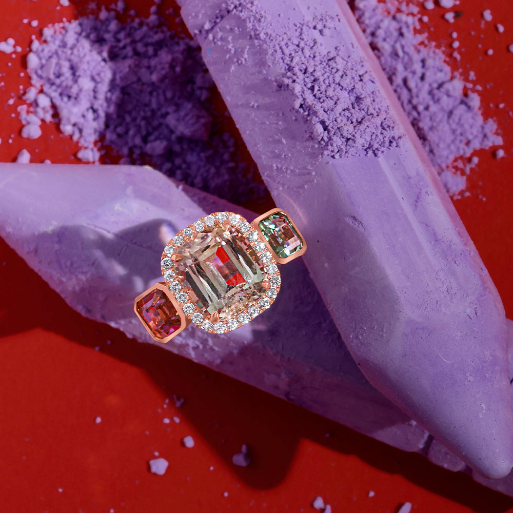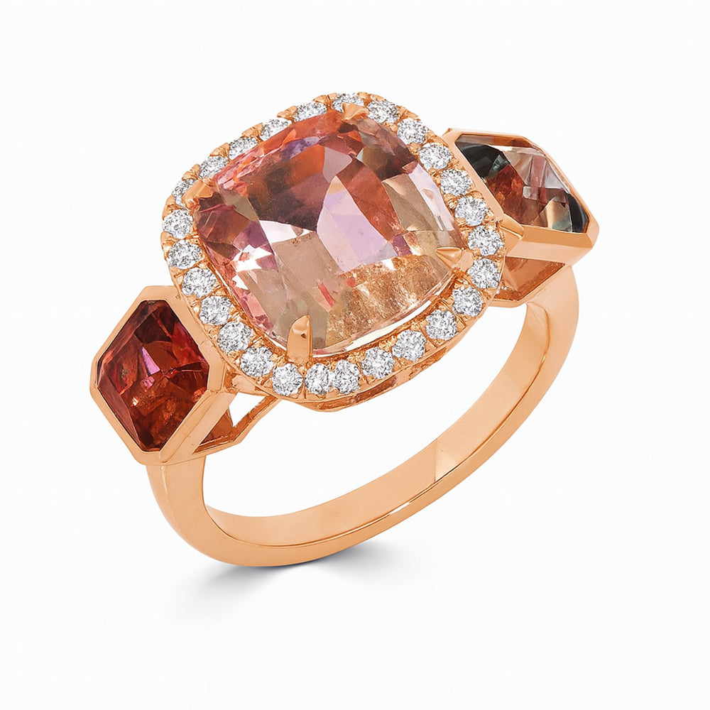 A stunning ode to symmetry and nuance, the Modo ring captures the quiet power of balance. At its heart lies a radiant bicolour tourmaline, artfully blending hues of blush and sage, set in an elegant trilogy composition. On either side, tourmalines in complementary tones echo the center’s richness—creating a visual rhythm that feels both modern and timeless. A delicate halo of pavé-set diamonds surrounds the central stone, adding a touch of brilliance and framing the centerpiece like a whisper of starlight. Crafted in rose gold, the piece is a study in understated luxury and architectural precision—true to Zome’s Forme philosophy
