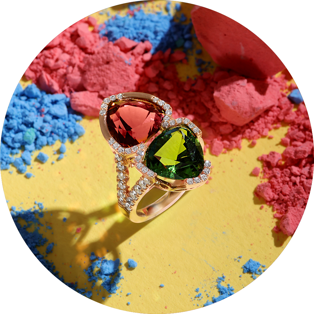 Sculptural. Radiant. Eternal. The Vetra Ring embodies the poetry of contrast — a deep rose tourmaline and a luminous green tourmaline, captured in perfect harmony. Each gemstone, unique in hue and energy, is framed by a beautifully sculptural split bezel, flowing around them like a continuous loop of light. Set in gleaming gold, the band shimmers with delicate diamond detailing — a subtle sparkle that accentuates the timeless beauty of the stones without overpowering them. Part of Zome’s Ourea Collection, Vetra celebrates the meeting of strength and serenity, passion and renewal. It is a piece designed to be worn for a lifetime — a symbol of balance, artistry, and infinite grace