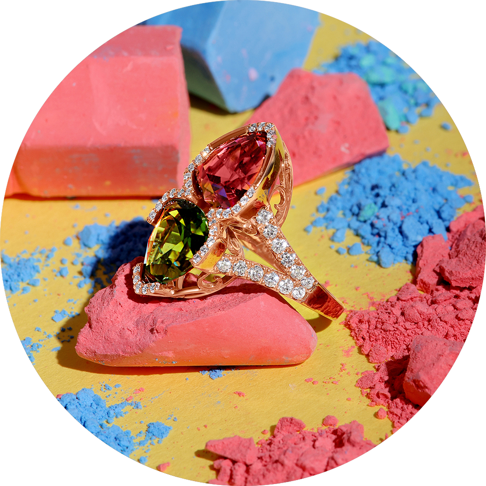 18k Rose Gold | 6.29 Cts Pink Tourmaline | 4.98 Cts Green Tourmaline | 0.84 Cts Diamonds | Multi Tourmaline & Diamond Ring