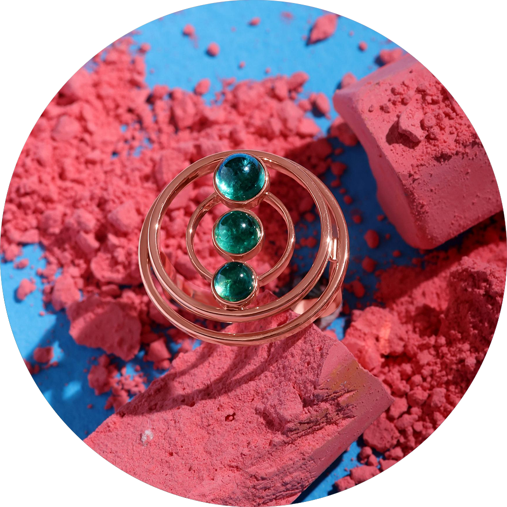 Celestine,” a crown jewel of Zome’s Eternelle collection, symbolizes the cosmic dance of celestial bodies. Meticulously crafted in sumptuous 18k rose gold, this ring is set with a trio of luminous emeralds, renowned for their vibrant green that captures the essence of life and luxury. Each emerald, selected for its rare beauty and profound color depth, evokes the enigmatic energy of distant nebulas. The ring’s design, inspired by the endless expanses of the universe, swirls around these precious gems, making it a testament to the elegance and mystery of the cosmos. “Celestine” is a tribute to the timeless allure of emeralds, celebrating their natural majesty and the exquisite craftsmanship that brings them to light.