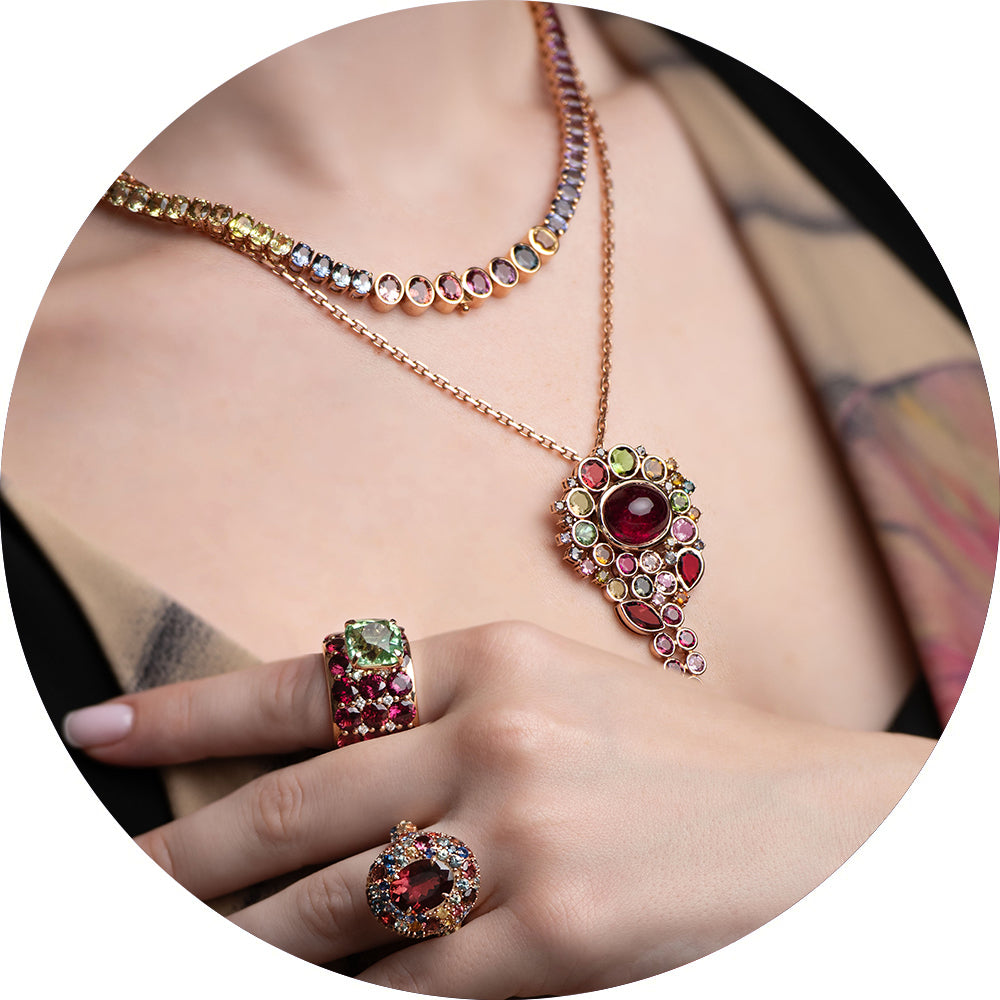 A masterpiece of contrasts and harmony, Verdora is a bold testament to Zome's artistic vision. At its heart lies a stunning green tourmaline, its vibrant hue symbolizing renewal and vitality. Encircling the centerpiece, a band of fiery red garnets radiates warmth and passion, their intensity beautifully offset by the delicate sparkle of interspersed diamonds. Set in luxurious rose gold, Verdora seamlessly blends elegance with drama, making it a statement piece that captivates and inspires. Perfect for those who appreciate the interplay of bold colors and timeless sophistication, this ring is a true celebration of individuality and artistry.